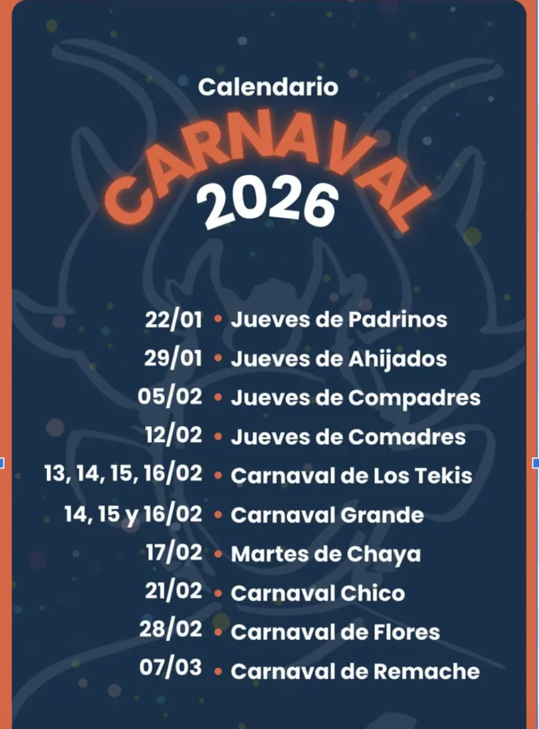 Los Carnavales de Los Tekis (13, 14, 15 y 16 de febrero) y el Carnaval Grande (14, 15 y 16 de febrero) constituyen el corazón de la festividad, junto con el Martes de Chaya (17 de febrero), una jornada de especial significado en la cosmovisión andina. A estos le siguen el Carnaval Chico (21 de febrero), el Carnaval de Flores (28 de febrero) y, para cerrar el ciclo, el Carnaval de Remache (7 de marzo).