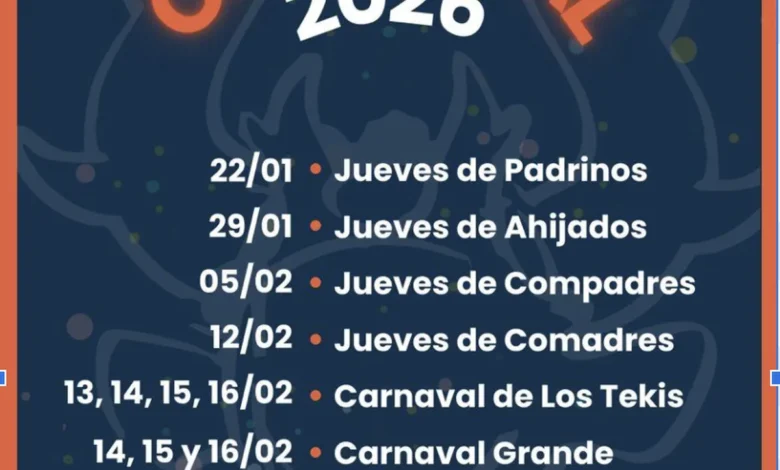 El recorrido carnavalero comienza el 22 de enero con los Jueves de Padrinos, seguido por los Jueves de Ahijados (29 de enero), Jueves de Compadres (5 de febrero) y Jueves de Comadres (12 de febrero). Estos encuentros previos generan expectativa y permiten que diferentes sectores de la comunidad protagonicen sus propias celebraciones antes de los eventos centrales.